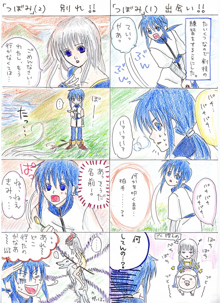 ちょーじん様から頂きました。このページに掲載の小説 「つぼみ」のパロディ4コマ漫画です。 ありがとうございます。(ぺこり)